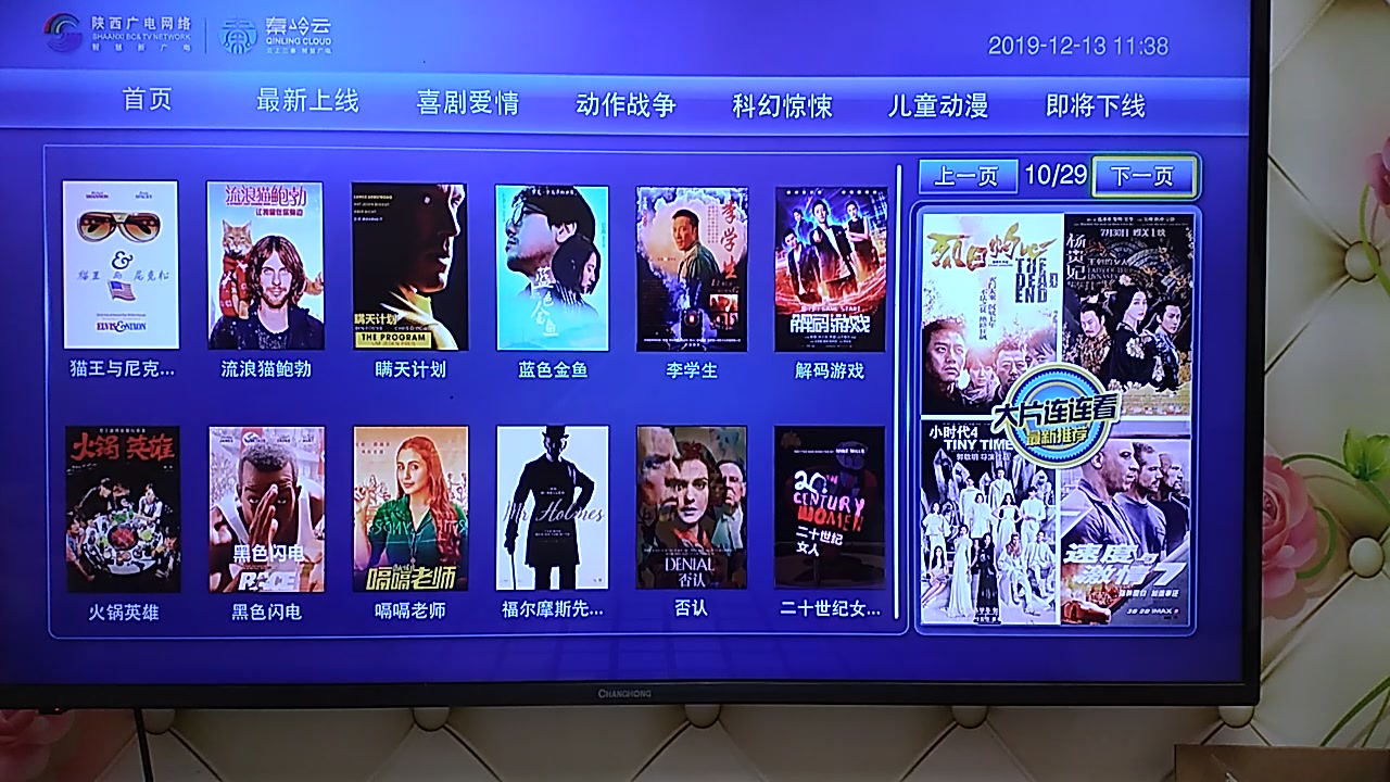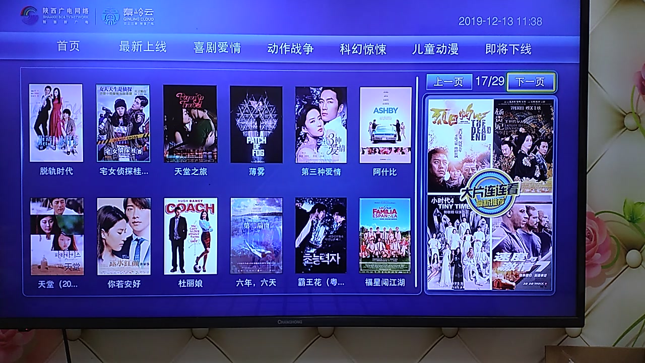 陕西广电网络 秦岭云 2019-12-1311:44 SHAANXI BCA TVNETWORK QINLING CLOUD 账户查询 电视营业厅 Q搜索历史设置 电竞 推荐 直播 回看 70华诞 影